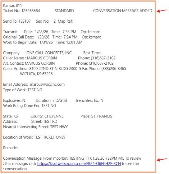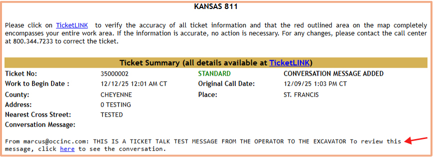 When a new Conversation Message is sent to an excavator, the excavator will receive an email copy of the ticket with the Conversation Message added to the ticket, along with a direct link to the complete ticket conversation history.